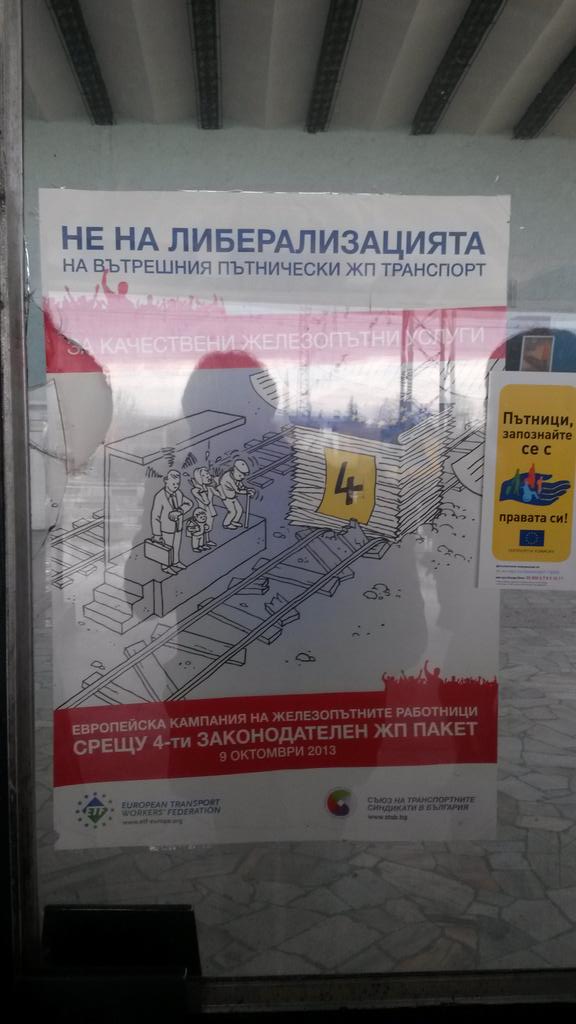 Пристигаме на Карлово и нищо не се случва. Нито кондукторът е предупредил някого за ставащото, нито някой минава да обясни. Ние сме информирани, но пътуващите от Бургас не са, и са доста изненадани. В гарата (на която е залепен призив към отричане на либерализацията на пътническите превози) ни казват, че автобусите още не са дошли, ама ще дойдат. Един неизвестен господин гръмко оборва това твърдение пред нас и казва, че те само лъжат и нищо такова няма. (Тук някъде се сещам за TGV-то Париж-Кале, което се счупи на два пъти, изпусна връзката в крайна гара на Кале, и нямаше транспорт до центъра в близките 3 часа, освен няколко таксита, едно от които споделих с няколко други чужди туристи и един албанец, неговорещ нито английски, нито френски)